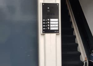 Een op maat gemaakt deurbelpaneel is gemonteerd op de gevel op een opbouwbehuizing. De deurtelefoontoestellen zijn vervangen door een Evercom DM2.